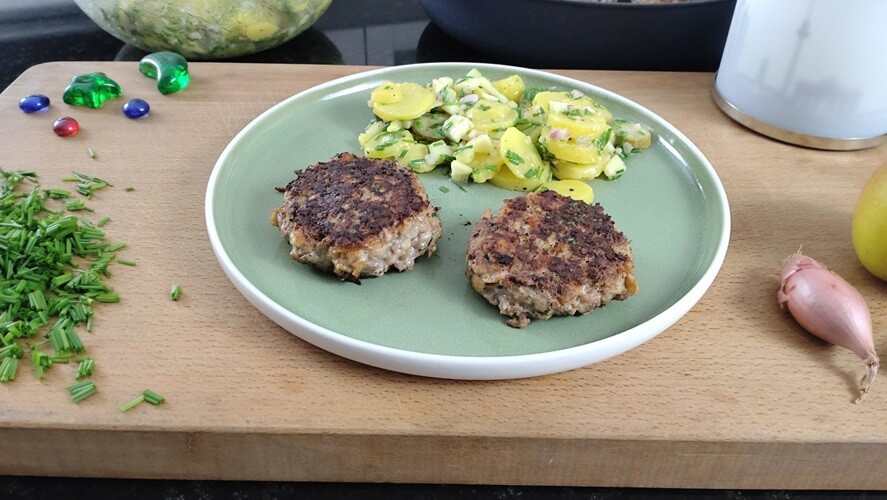 Die Buletten – an vielen anderen Orten auch Frikadellen oder gar Fleischpflanzerl genannt – schmecken in Kombination mit dem Kartoffelsalat besonders gut.