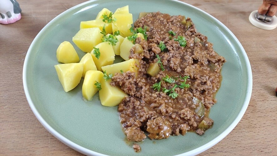 Doch die Kombination aus Kartoffeln und dunkler Hackfleisch-Sauce weiß durchaus zu überzeugen.
